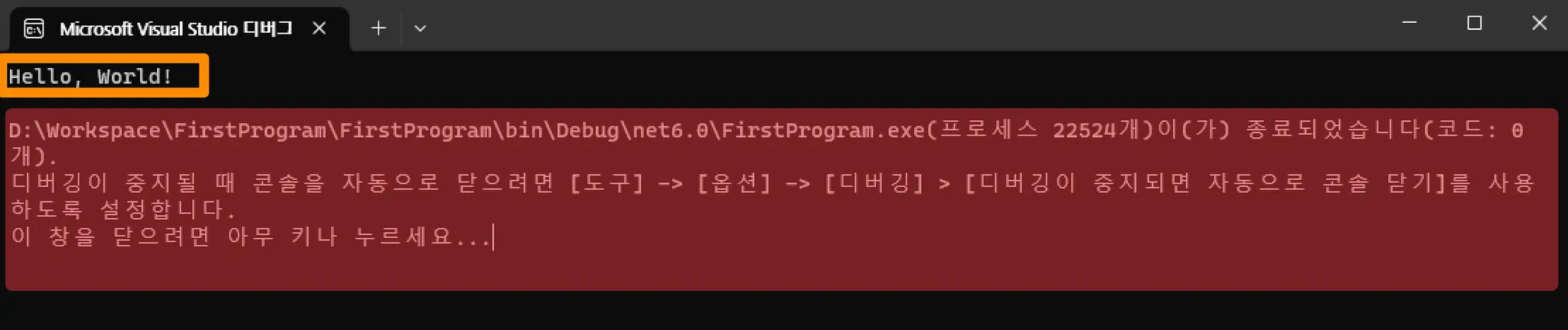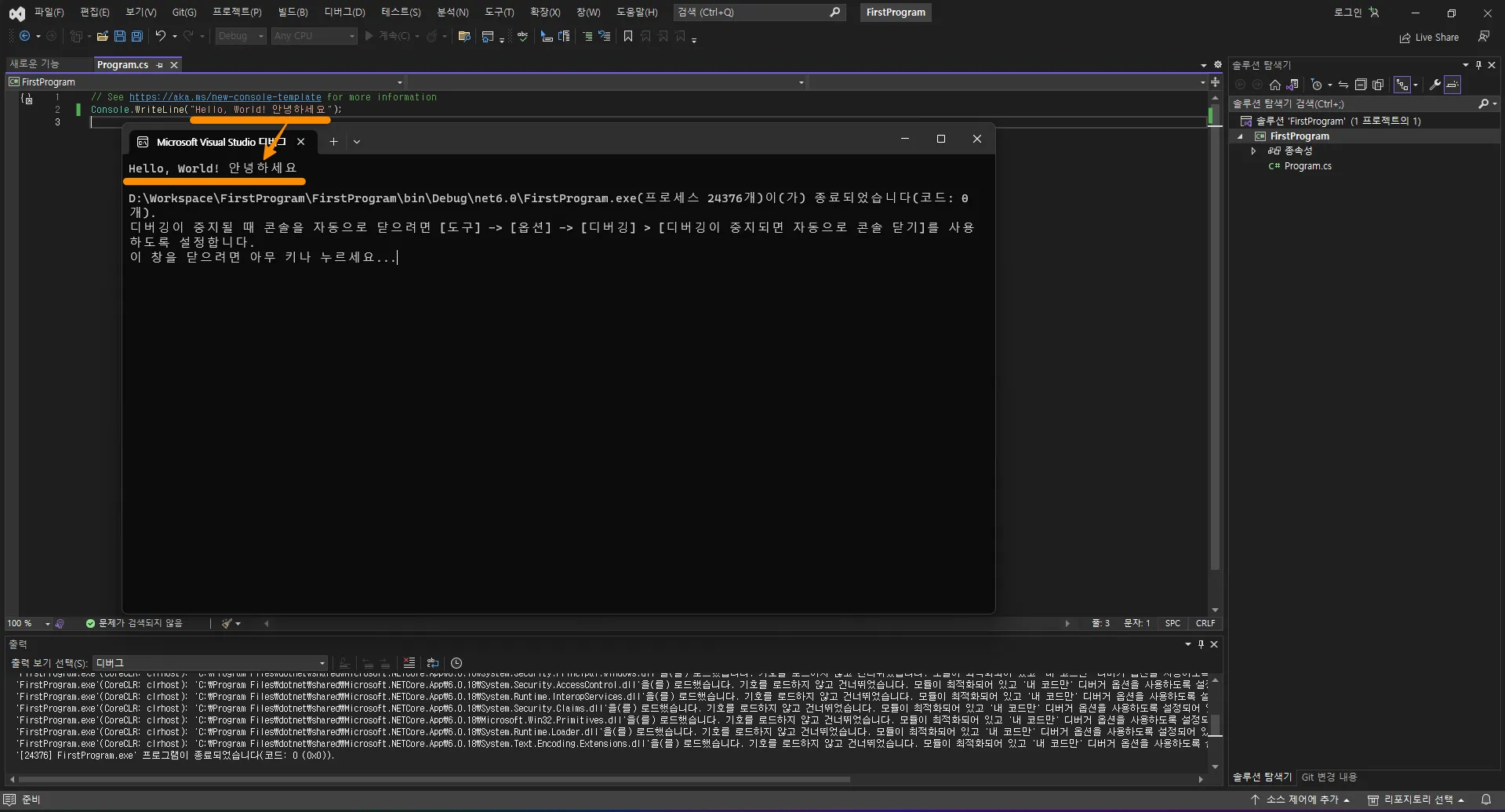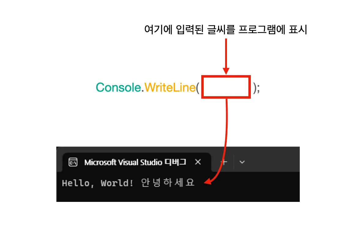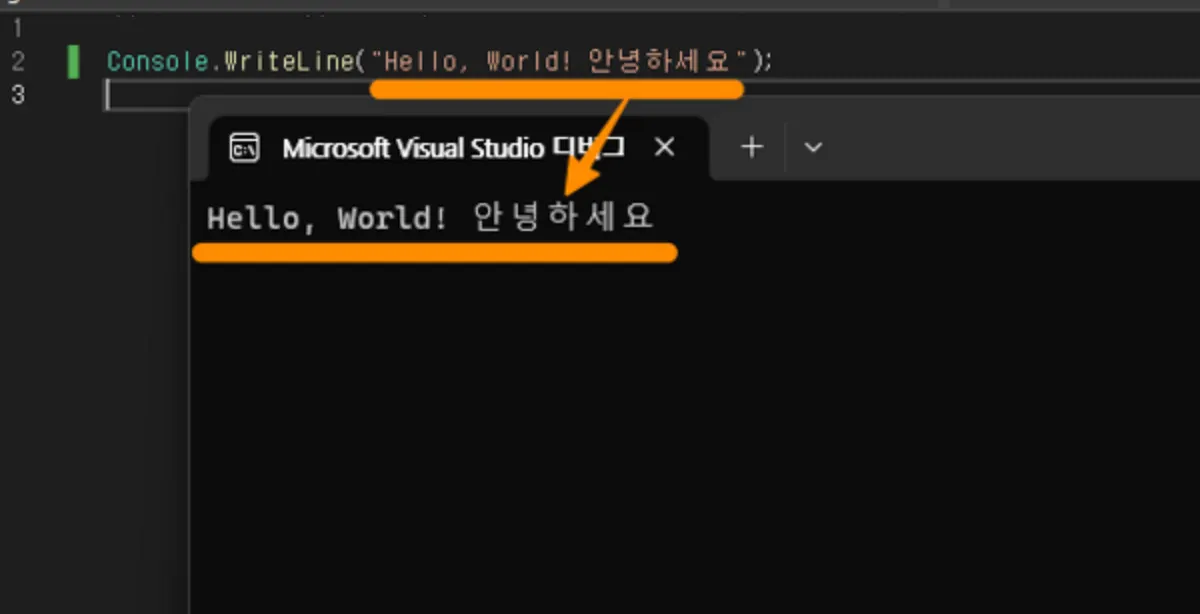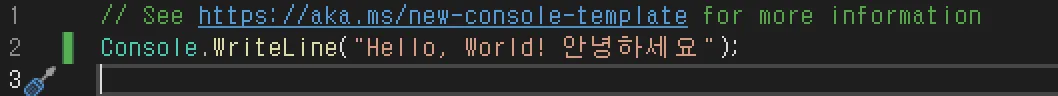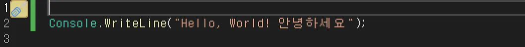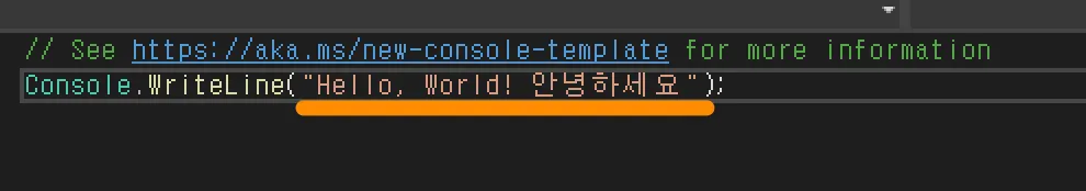 이제 Console.WriteLine(”Hello, World! 안녕하세요”); 부분만 남았습니다.
