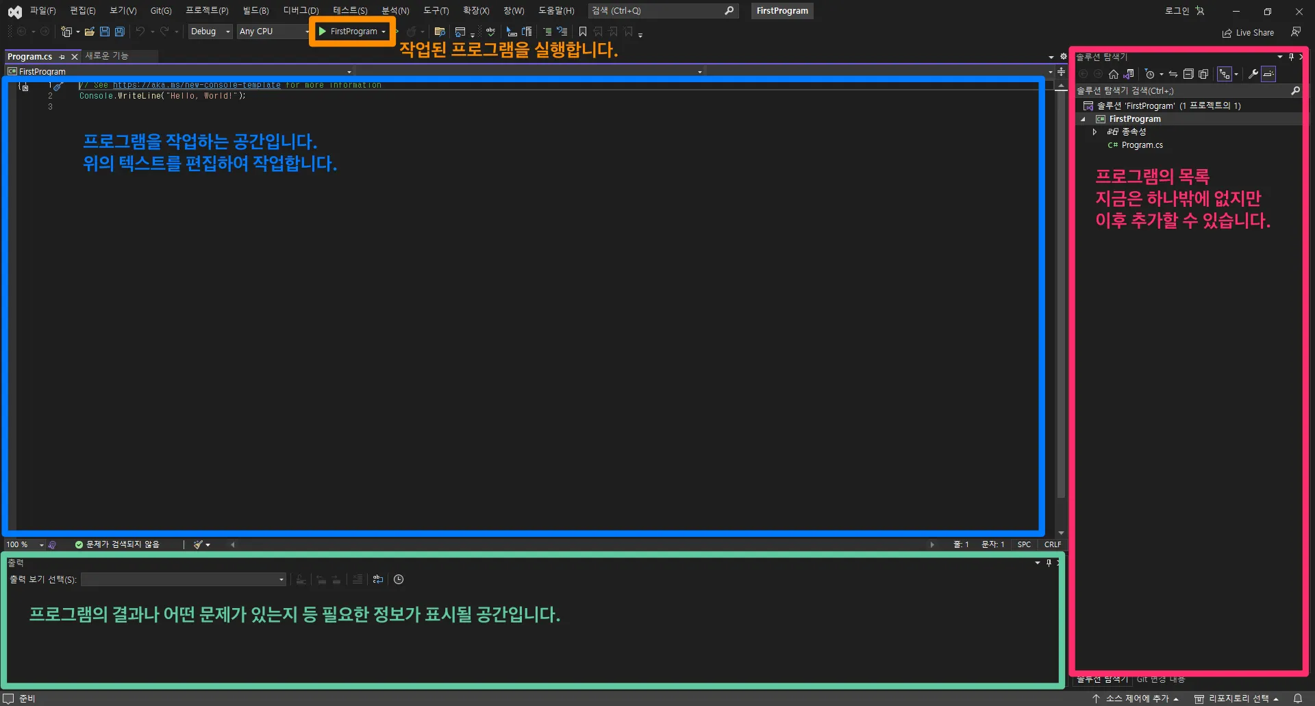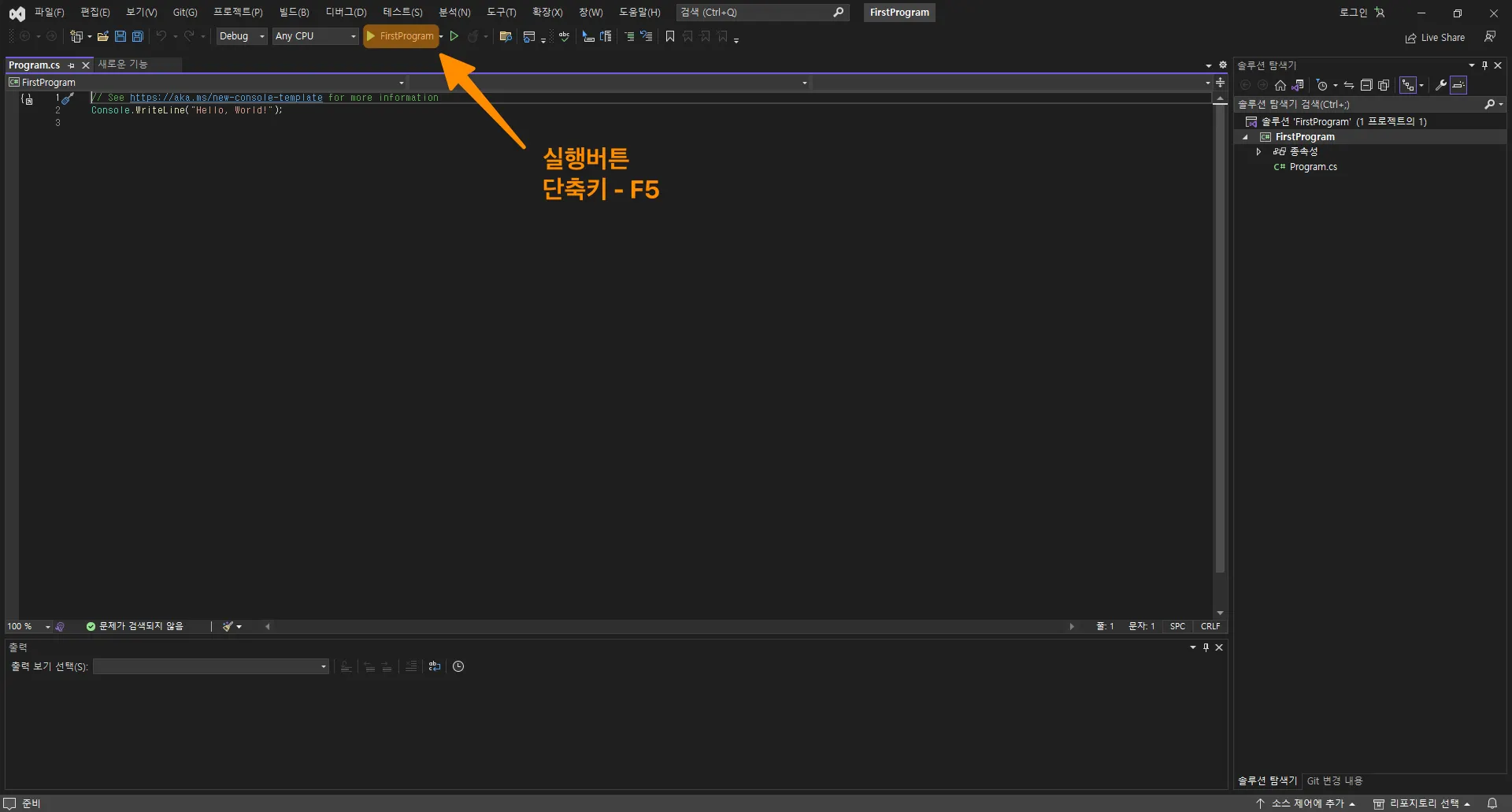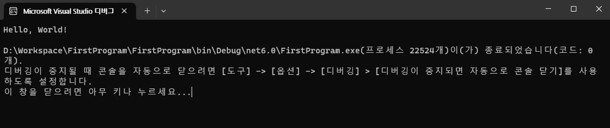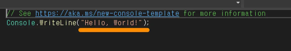 이제 Console.WriteLine(”Hello, World! 안녕하세요”); 부분만 남았습니다.