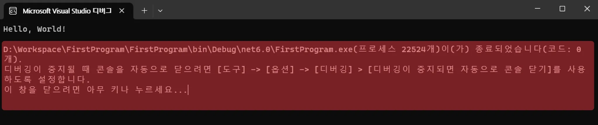 마찬가지로 C#에서는 Console.WriteLine(); 을 이용하면 프로그램에 메시지를 표시할 수 있습니다.