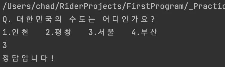 1. 퀴즈를 내서 정답을 맞추는 프로그램 작성해주세요.