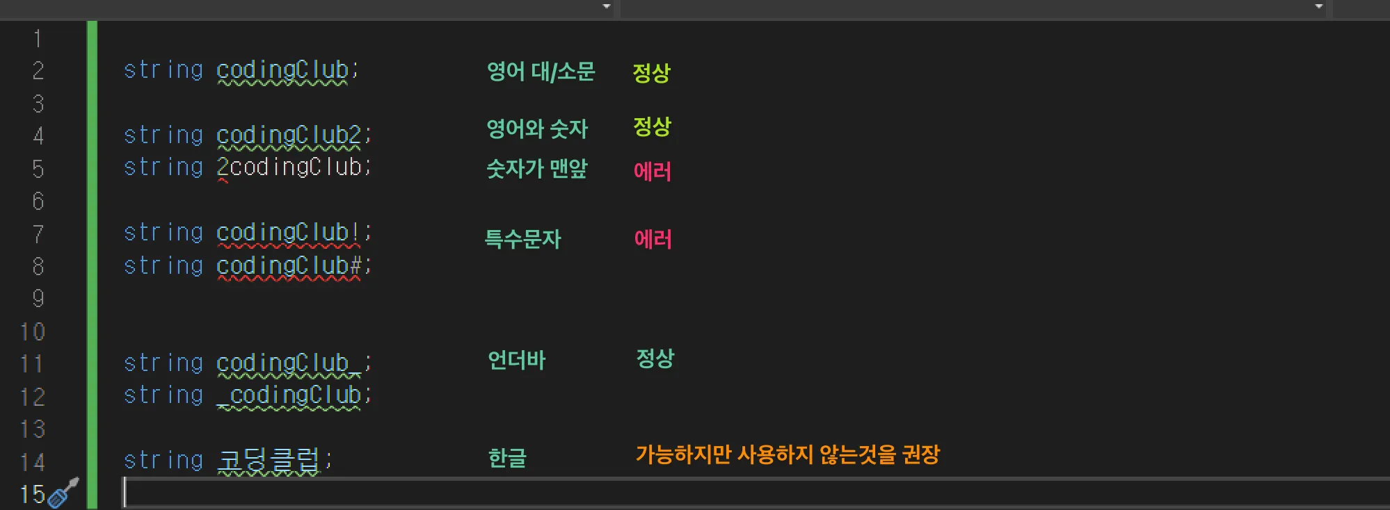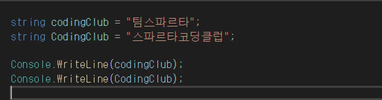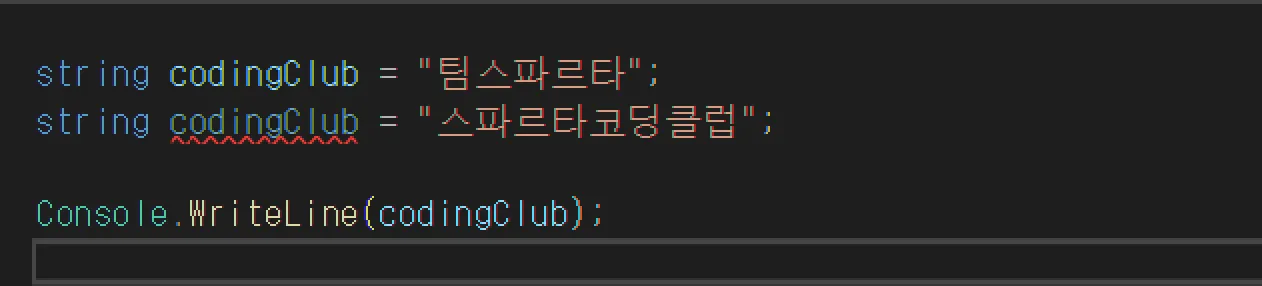 codingClub 이라는 변수 2가지를 만들었지만 에러가 발생한 것을 볼 수 있습니다. 같은 이름의 변수는 1개만 만들 수 있습니다.