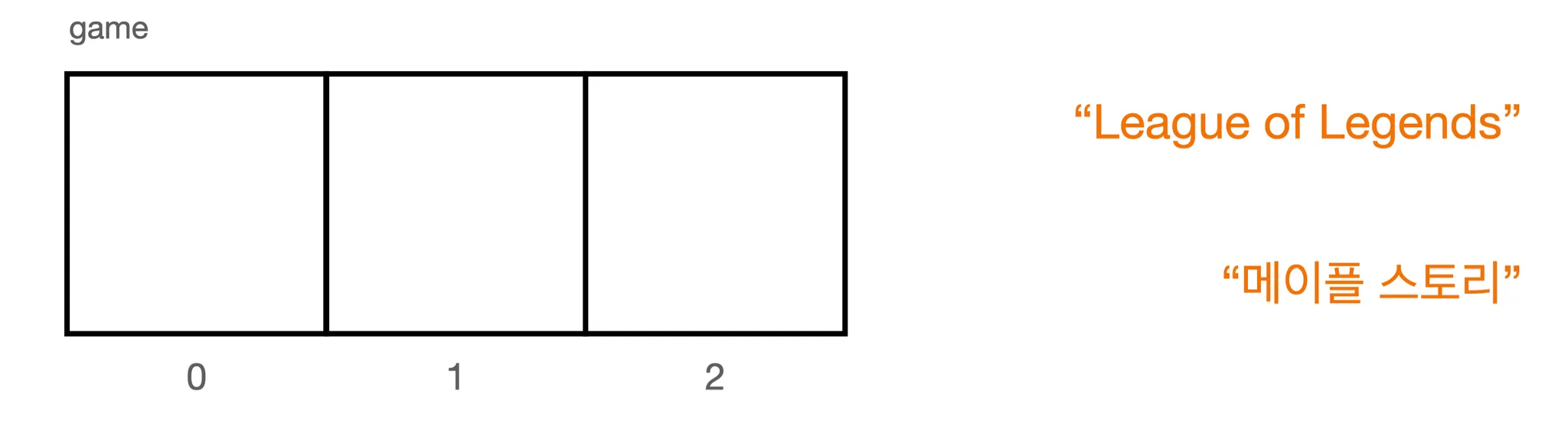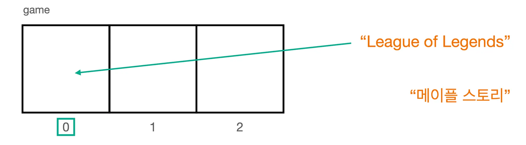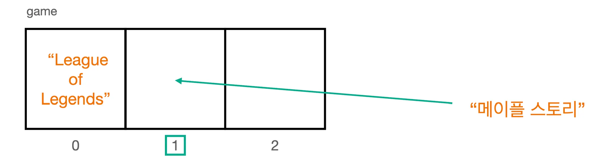 // game의 1호실에 “메이플 스토리” 데이터를 저장 string[] game = new string[3]; game[0] = "Leage of Legends" game[1] = "메이플 스토리"