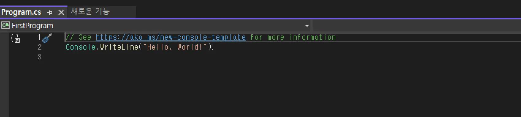 프로그램을 처음 만들었을때 Console.WriteLine(”Hello, World!”) 위에 초록색으로 표시된 // ~~~ 부분이 있었습니다.