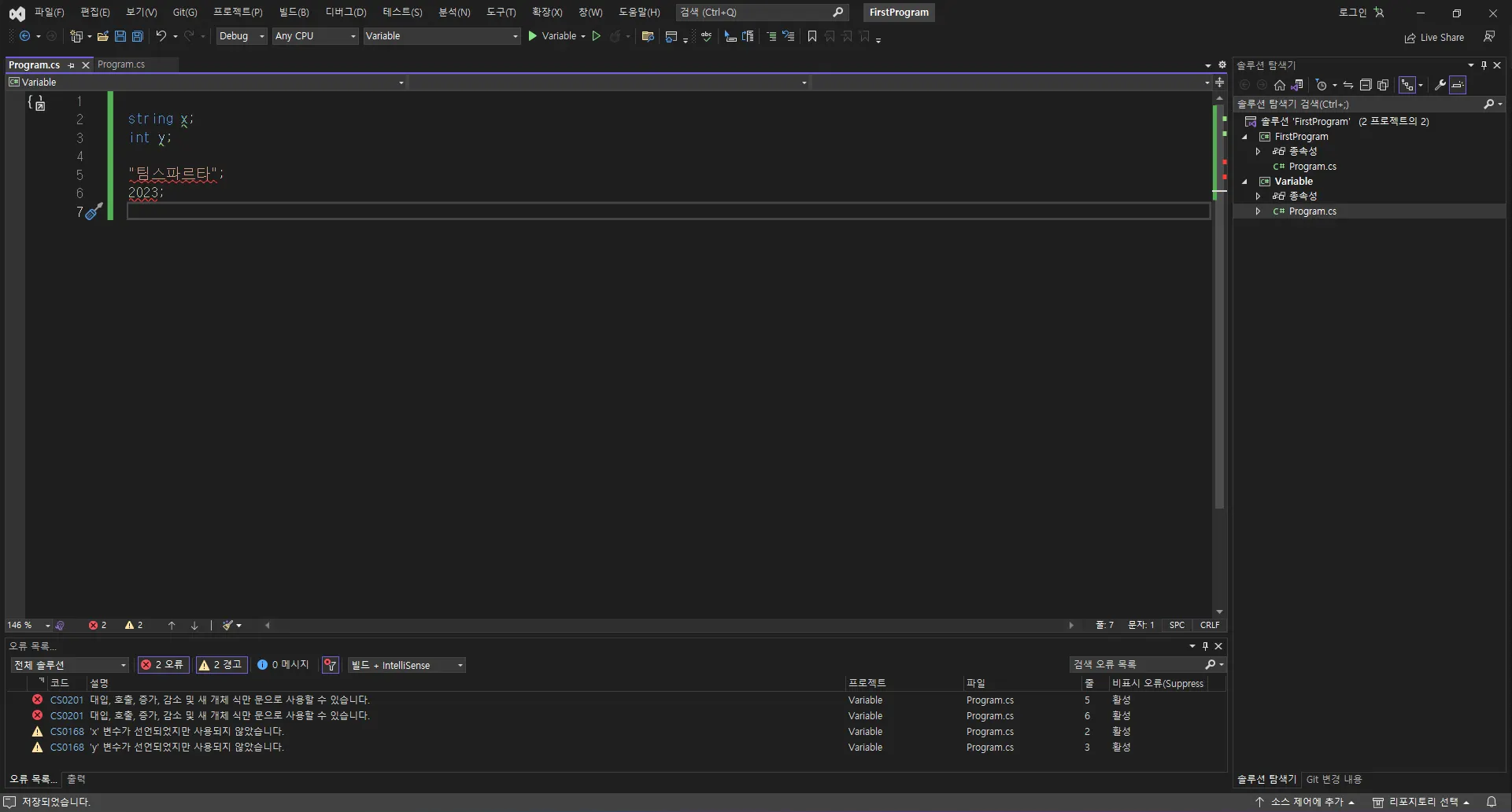 문자와 숫자가 들어갈 변수를 만든 모습입니다.